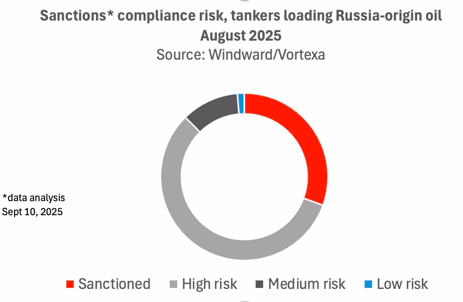 Western-sanctioned tankers shipped just over half of all Russian crude over August, level with the prior month.